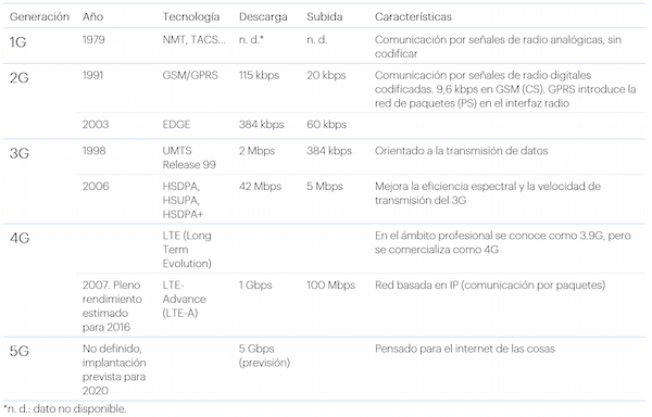 Encara que aquí hem de fer un aclariment important. La Unió Internacional de Telecomunicacions (UIT), que és l’organisme competent en aquest àmbit, va establir les especificacions de connectivitat que el 4G havia de complir. La principal era que, en condicions ideals, havia de poder assolir una velocitat de descàrrega d’1 Gbps. Però, ateses les dificultats tècniques per aconseguir aquests resultats, l’organisme estandarditzador va acceptar de reservar la denominació Long Term Evolution (LTE) per a un objectiu menys ambiciós i més assumible en el curt termini i va anomenar Long Term Evolution – Advance (LTE-A) a l’estàndard inicialment especificat. Per tant, l’LTE seria una millora respecte al 3G (anomenada per aquest motiu per alguns 3.9G), mentre que l’LTE-A seria la veritable entrada a la generació 4G. Per desgràcia, la indústria va pressionar per poder comercialitzar l’LTE com a 4G i la UIT va acceptar, fet que ha provocat una notabilíssima confusió. Serveixi almenys la taula per aclarir aquests conceptes.