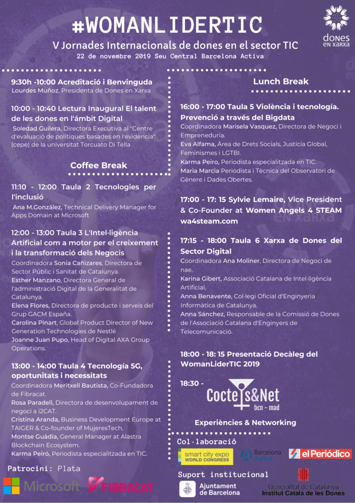 A continuació pots consultar el programa #WomanLiderTIC 2019. Per a més informació i inscripcions, fes clic aquí. T’hi esperem!