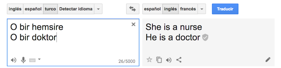 Un caso analizado dentro de este estudio fue la traducción automática, poniendo como ejemplo la traducción del turco al inglés con el servicio de traducción de Google. A pesar de que el turco tiene pronombres neutros, el traductor interpretó las frases con pronombres estereotipados: