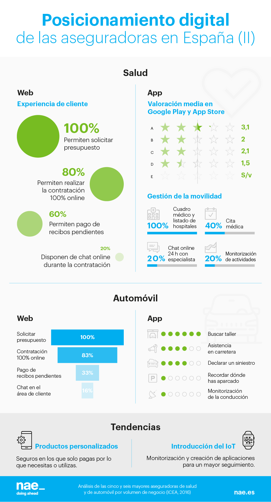 En esta segunda parte del estudio, hemos analizado las cinco mayores aseguradoras de salud y las seis de automóvil (ICEA, 2016). El análisis realizado se focaliza en las fases de venta y atención al cliente dentro del ramo de salud, centrado en el proceso de contratación y en el caso de autos, las aplicaciones móviles específicas de cada una de las aseguradoras.