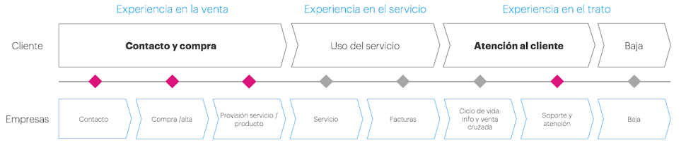 Para el análisis, hemos tenido en cuenta los puntos de contacto dentro del pasillo de experiencia de cliente entre las aseguradoras y el asegurado, de tal manera que se analice el nivel de digitalización en los moments of truth.