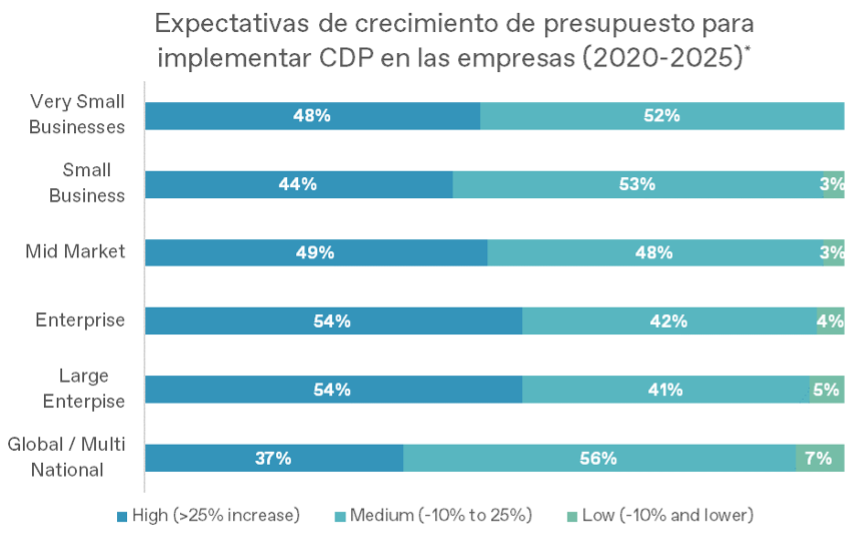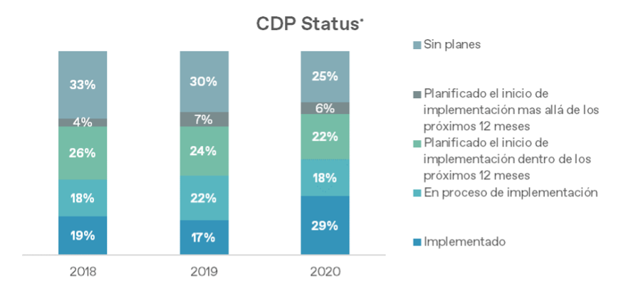 Durante 2020 la implementación de las CDPs ha crecido hasta alcanzar un 29% de empresas que ya lo han implementado y un 18% adicional que están en proceso de implementación. Y la tendencia, según diferentes estudios de mercado, es que las inversiones sigan creciendo, independientemente del tamaño de las empresas.